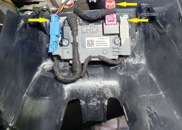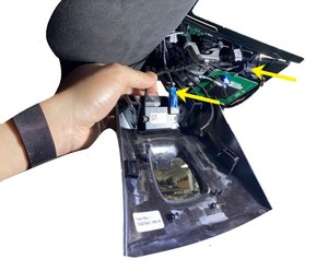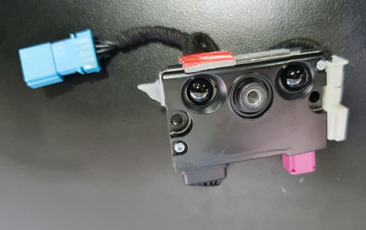 - 小心地将摄像头上盖向下拉动,松开卡子(4 个),断开电气连接器(3 个),然后将摄像头上盖从车辆上拆下。