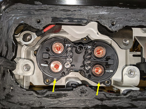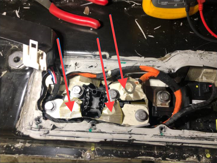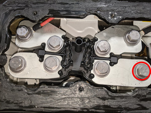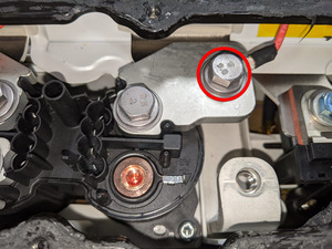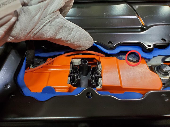 仅适用于 2022 年 9 月 19 日之前生产的车辆 - 如果有云母胶带盖住将母排固定到高压电池快速充电触点开关的螺栓,请用手机拍下照片,然后取下并保留胶带以便进行安装。