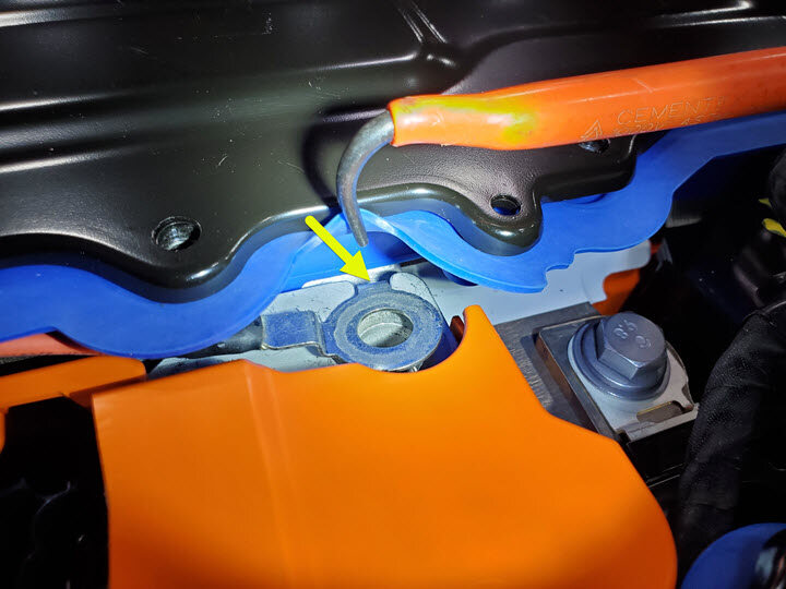 仅适用于 2022 年 9 月 19 日之前生产的车辆 - 如果之前已取下,则将云母胶带粘贴到将母排固定到高压电池快充触点开关的螺栓上。