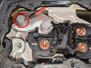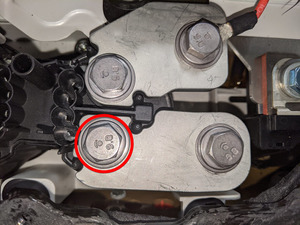 - 仅适用于 2022 年 9 月 19 日及之后生产的车辆 - 拆卸并弃置将快充负极输入母排固定到直流负极输入母排的螺栓。