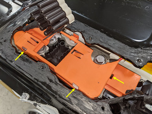 - 将高压电池快充触点开关从导销(2 个)上拆下,并使其脱离高压电池。