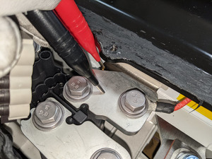 警告请勿使探针侧面接触到母排边缘。注电阻值必须小于 0.045 毫欧(45 微欧)。高压接头电阻过大。拆卸紧固件,使用异丙醇清洁接触区域,重新安装紧固件,再次测试。