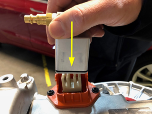 注固定壳体测漏仪软管,使其不会将泄漏测试仪从驱动单元逆变器高压接头中脱落。