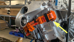- 按下锁片,断开后副车架电气线束与驱动单元变流器逻辑连接器的连接,然后将电气线束移至一旁。