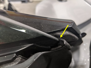 左侧前车门密封条上部与车门总成由卡子连接,将此处的卡子拆下。