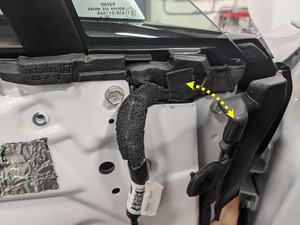 将左侧前车门密封条顶角放回原位,并将连接密封条与车门总成的卡子固定。