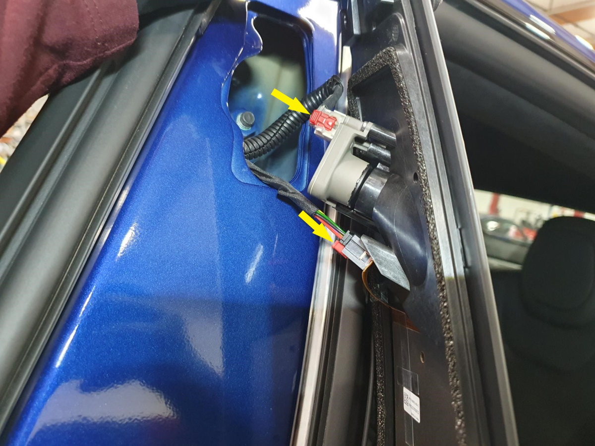 - 小心断开摄像头电气连接器,然后拆下 B 柱饰板。