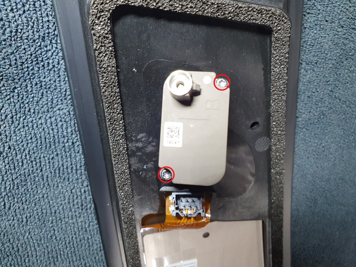 仅适用于配备 HW4 的新款车型:拆下将摄像头固定到 B 柱饰板上的螺栓(2 个)。