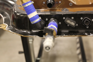 6. 取下高压电池冷却液回流接头处(右侧)的塞子,立即将 P2 电池排放适配器连接到接头,然后对接头执行推拉推测试。