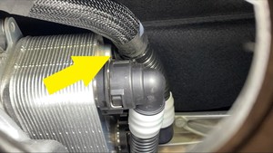 - 松开软管夹,断开后驱动单元逆变器至热交换器软管与机油冷却器的连接,然后让液体排出。