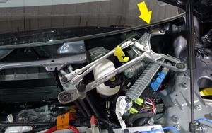 注通过 Controls > Service > Wiper Service Model;如果雨刮器模块不在维护模式中,拆卸时,RH 枢轴臂将不会与 V 型支架横梁顺利脱离