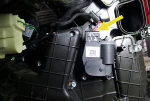 注3 个螺钉,T20,2.3 Nm, 1 条基线;将左侧地板风管重新摇摆装回 HVAC 外壳;固定除霜风管温度传感器线束