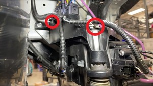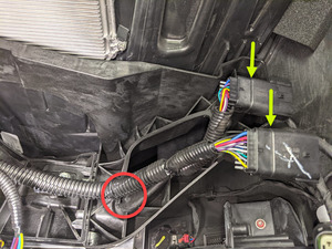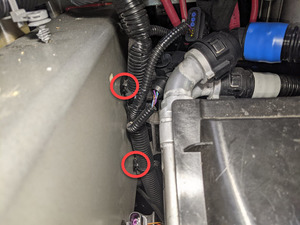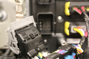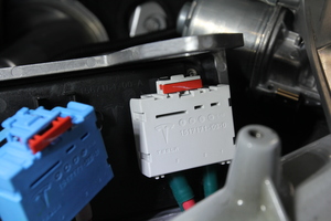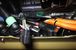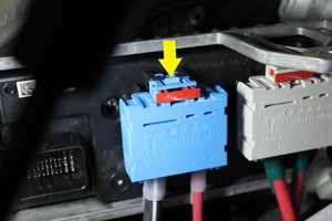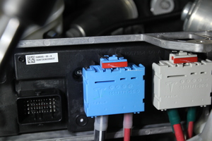 注2x connectors Secure FRL first, Seat LV battery connection and push black connector lock inwards to secure, Engage green locking tab when fully seated