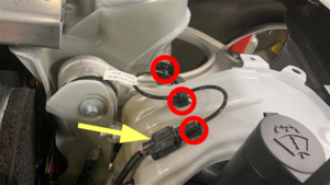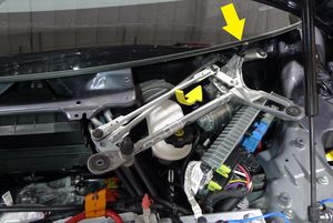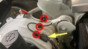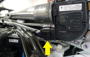 注3x bolts, 10mm, 8 Nm, 1x connector, Rotate module forward and up to access connector, Observe LH wiper arm pivot during removal to avoid damage to windshield