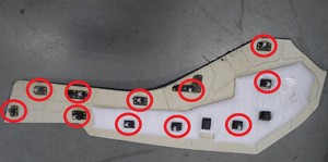 注2x tabs, 2x datums, 2x slots, , Be cautious and do not damage the mounting clips, Maneuver cover forward and up in front of V-brace cross member