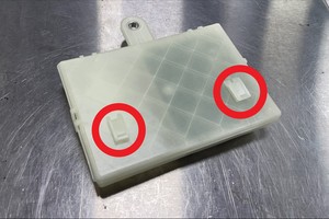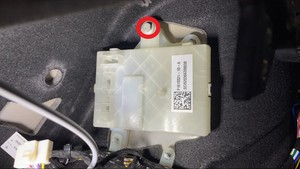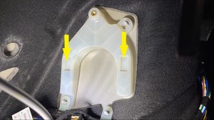 - 松开锁片(2 个),然后将充电接口电子控制单元 (ECU) 向上移动到支架上。从车辆上拆下电子控制单元 (ECU)。