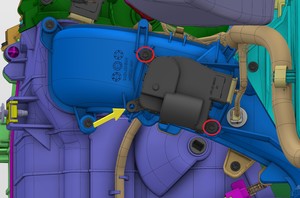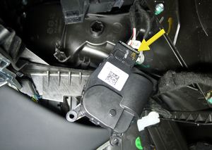 - 断开电气连接器,然后从车辆上拆下右侧脚部空间风管执行机构。