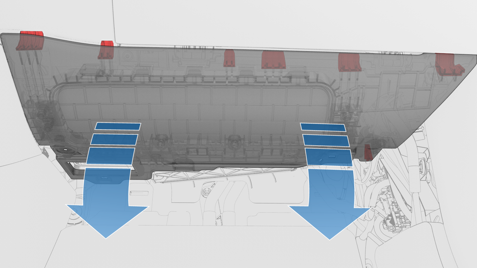 - 勾上锁片(6 个),之后将副驾位膝部气囊放到仪表盘上,然后将气囊就位到仪表板。