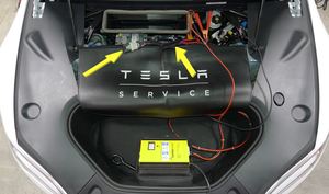 - Plaid vehicles only - Place a foldable funnel and absorbent material over the HV harness connectors and under the power conversion system coolant return hose to direct coolant away from the HV battery.