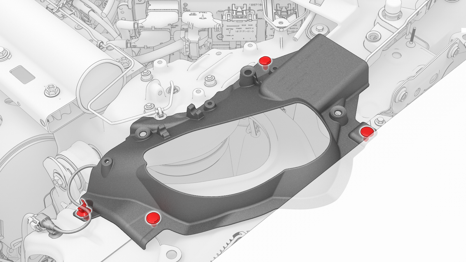 - 松开将左侧减震塔盖板连接到车辆的卡子(4 个),然后从车上拆下盖板。