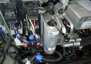 警告切勿忘记补充因取出旧干燥剂包而损失的机油量。否则可能导致温度系统发生严重损坏。 - 连接低压电源。请参阅低压电源(断开和连接)。