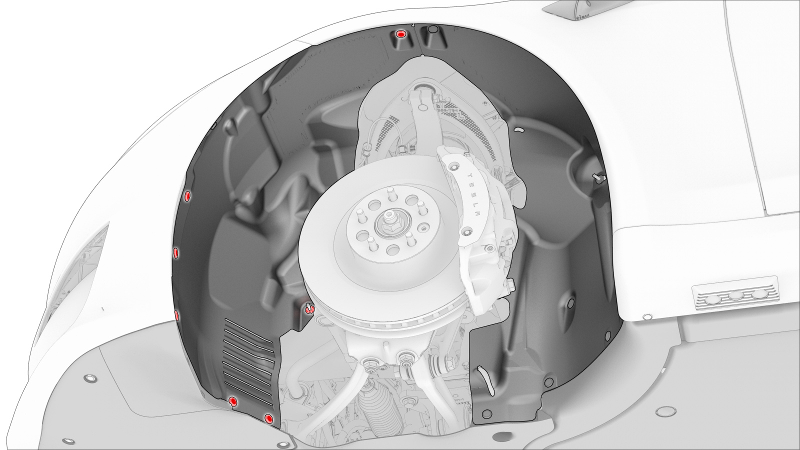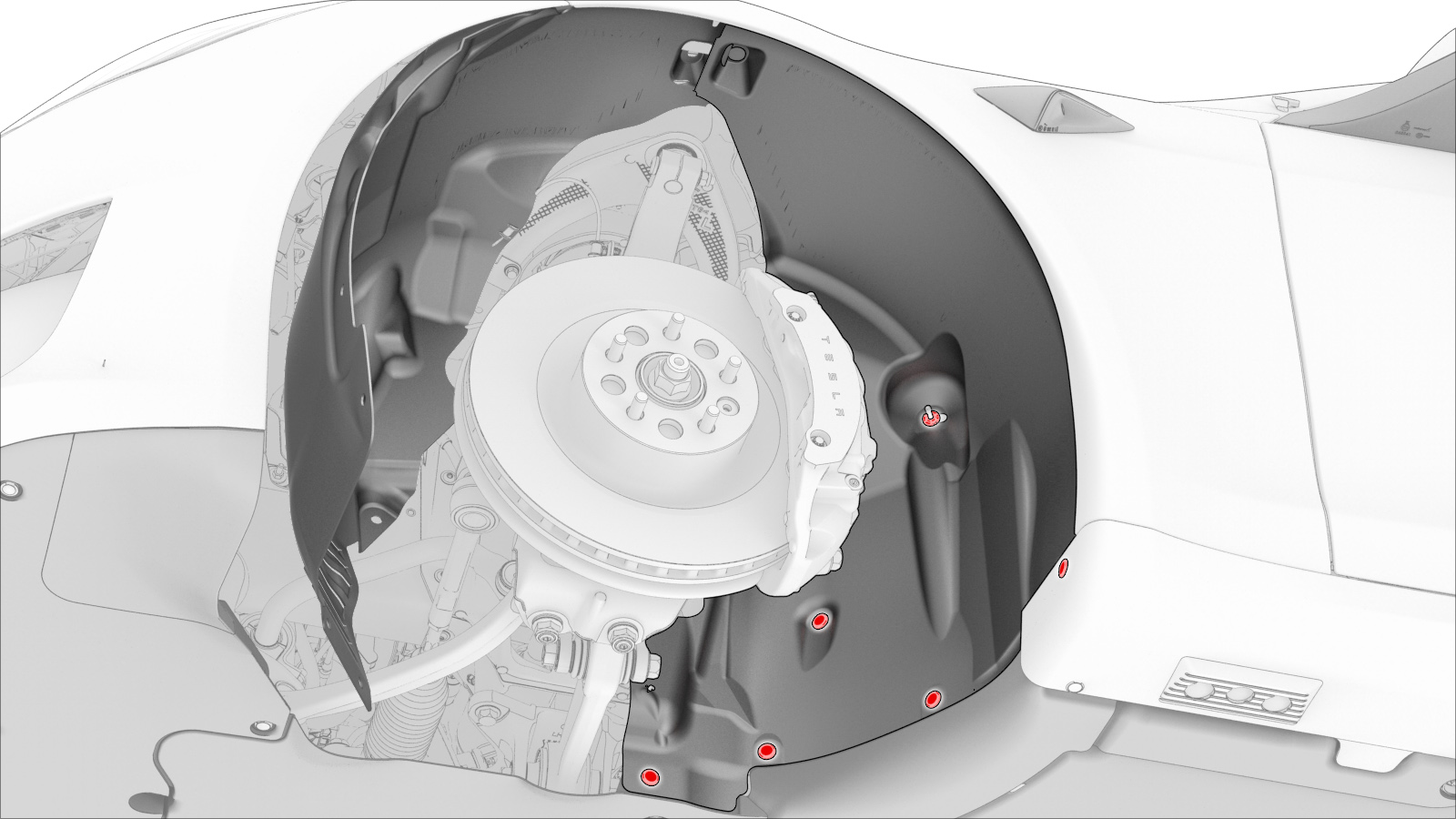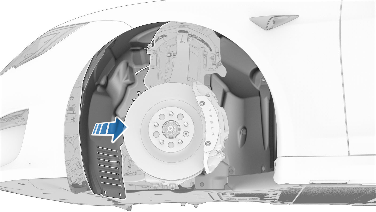 - 松开将左侧前轮拱内衬前部固定到车身的卡子(7 个),然后将内衬移到一边。