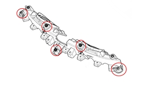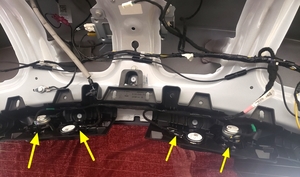 - 将掀背车中央饰板支架总成放置到掀背尾门上,然后安装卡子(2 个推拉式卡子,3 个白色夹),以便将支架固定至掀背尾门上。