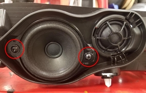 将掀背尾门扬声器(4 个)放置进掀背尾门中央饰板支架,然后安装锁片(6 个)以及将扬声器固定至支架的螺钉(4 个)。
