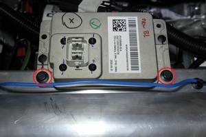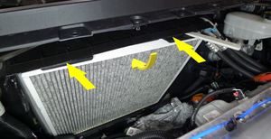 注2 个螺母,10 毫米,7 Nm,将 V 型支架横梁向前旋转,以便能接触到 HEPA 总成的固定螺母,将总成向前向上移出车辆。