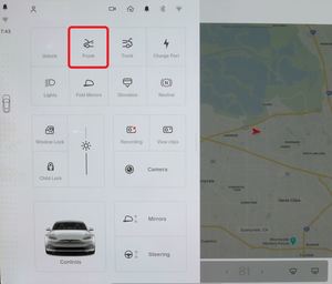 注在中央显示器触摸屏上,点击 Quick Controls > Frunk Open。