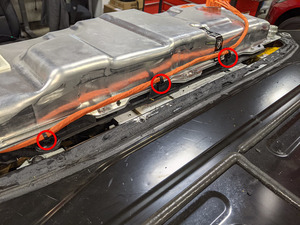 拆卸将功率转换系统出口软管固定到高压电池的卡子。