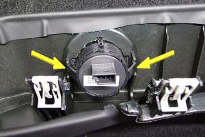 - 松开将第二排左侧座椅折叠开关组固定到肩部塑料饰板的锁片(2 个),然后从饰板上拆下开关。
