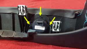- 将第二排右侧座椅折叠开关放置到座椅肩部塑料饰板上,然后紧固将开关固定到饰板上的锁片(2 个)。