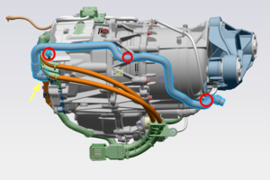 注1 个 EP10 螺栓,扭矩 5 Nm +20 度。注松开红色锁片,小心地打开杆,以拆下电气连接器。注将卡子从前驱动单元上松开。