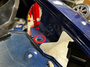 拆下将左侧翼子板固定到 Shotgun 支架的中心上部螺栓。