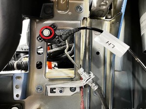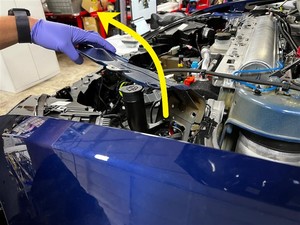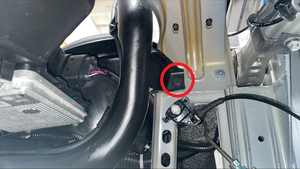- 在轮拱内衬上对左侧前减震器线束进行布线,然后固紧卡子。