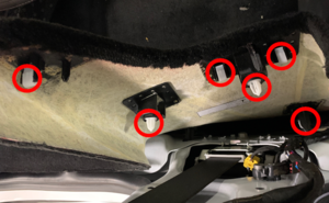 2 个系带夹,1 个卡子,1 个连接器;沿仪表板和扬声器格栅滑动饰板底部,将系带固定到车身侧;从底部开始向上放置卡子;将密封件拉过饰板