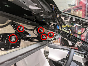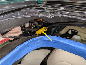 4 个卡子,3 个连接器,确保后视镜线束的布线方式是自由悬挂在外部,而不是被盖板和遮光板总成夹住
