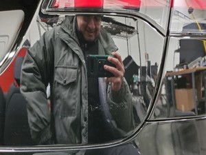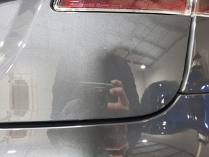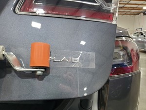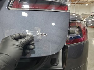 将前侧保护膜贴到 Plaid 字母徽标上,用叠缝滚压机辅助施力,确保每个字母都完全粘合在掀背尾门上,然后从徽标上撕下保护膜。