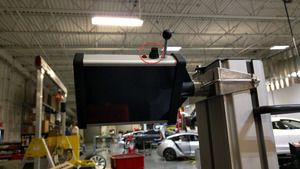 - 启动测试仪顶部旁边的校准激光器,然后按需转动测试仪,将激光器对准前备箱盖的两侧支柱底座。