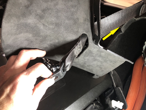 - 将左侧 C 柱上部饰板放置在 C 柱上,将安全带穿过饰板,然后紧固将饰板固定到车上的卡子(7 个)。