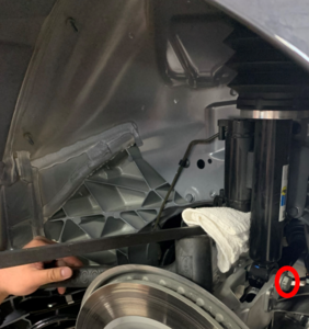 - 在助手的帮助下,使用撬杆顶住无弹力锤,撬起左侧后主动减震器阀体,卸下将减震器固定到左侧后转向节的螺栓,然后拆下螺栓。
