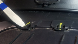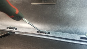 注将撬棒插入下部饰板锁片后方,然后旋转撬棒将饰板总成锁片向上撬起。