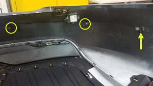 - 将后扩散器放到后饰板总成上,然后紧固将扩散器固定到饰板的锁片(8 个)。