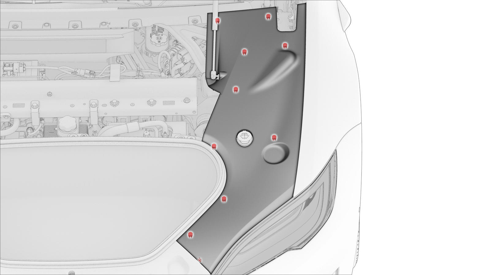 - 将左侧前备箱后部挡板安装至车身,然后紧固将挡板固定到车身的卡子(10 个)。