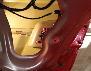 拆下橡胶盖板(2 个),然后拆下将左侧后雾灯/倒车灯固定至掀背车门的螺母(4 个)。