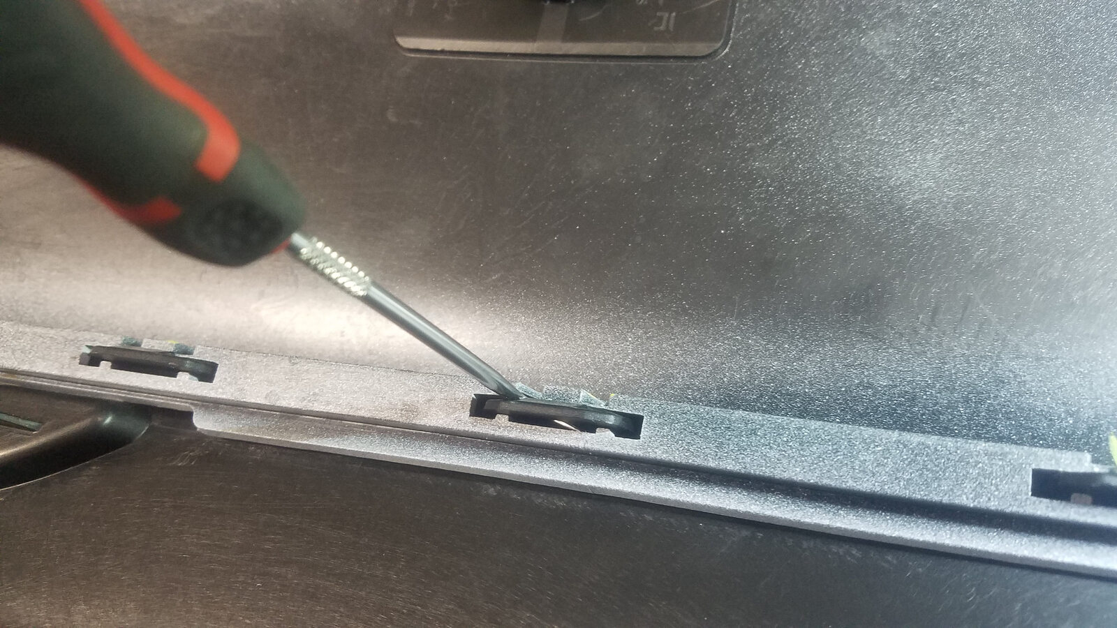 注Insert a pick behind the lower fascia tab, and the rotate to pry the fascia assembly tab upward.