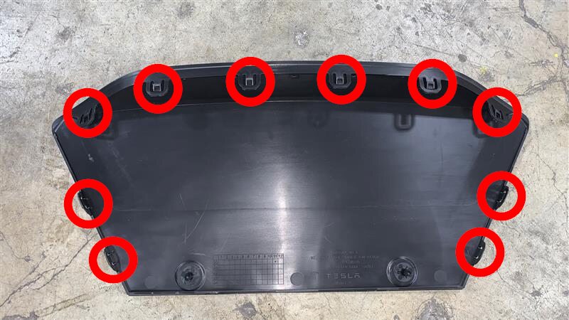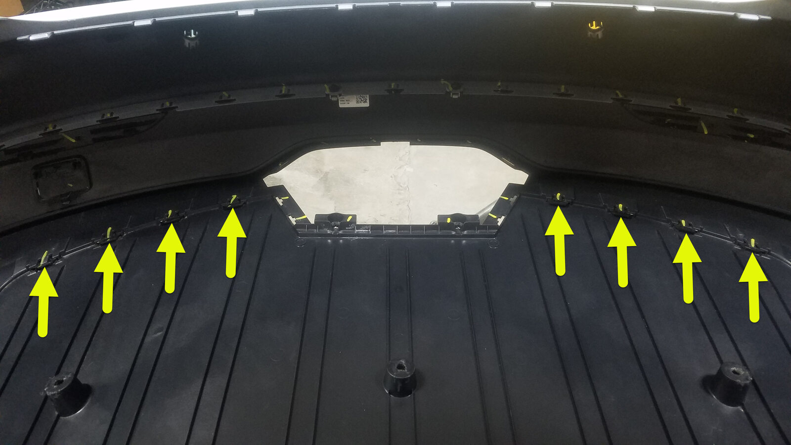 tabs (x10) that attach the tow hitch cover to the rear fascia assembly, and then remove