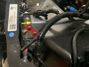 拆下将左侧前端模块 (FEM) 支架固定到车辆的螺栓(2 个),然后将支架向后滑动,使其脱离前部托架基准,将其从车辆上拆下。