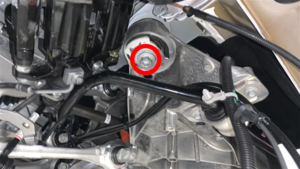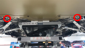 - 升起副车架举升机,直至副车架刚好接触到车身,然后使用电动工具安装将后副车架固定到车身的螺栓(4 个)。
